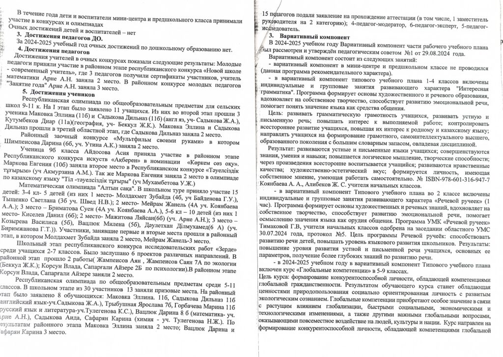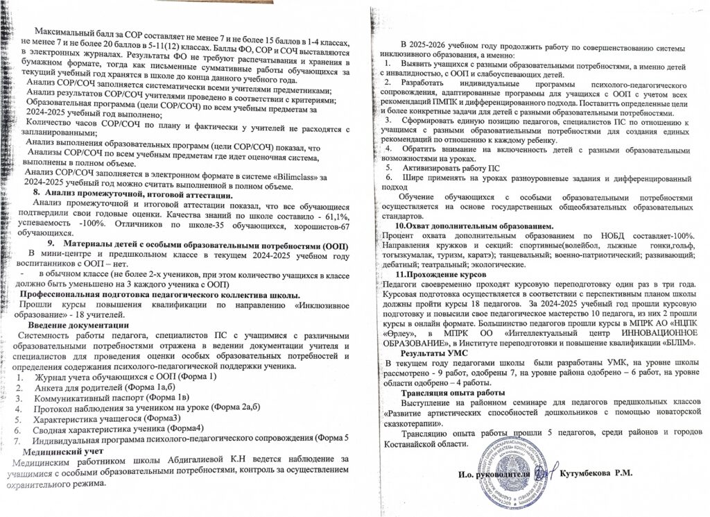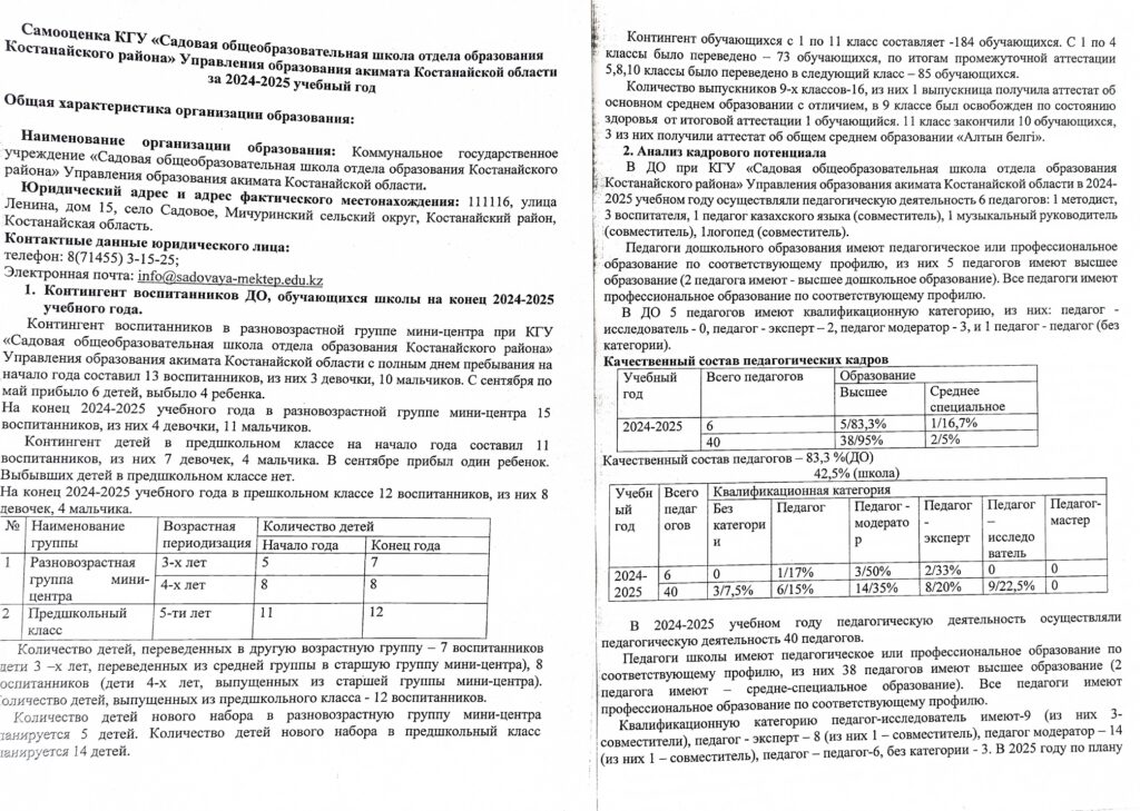 Қостанай ауданы білім бөлімінің «Ссадовый жалпы білім беретін мектебі» КММ 2024-2025 оқу жылында өзін-өзі бағалауы