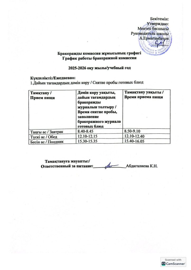 График работы бракеражной комиссии на 2025-2026 учебный год